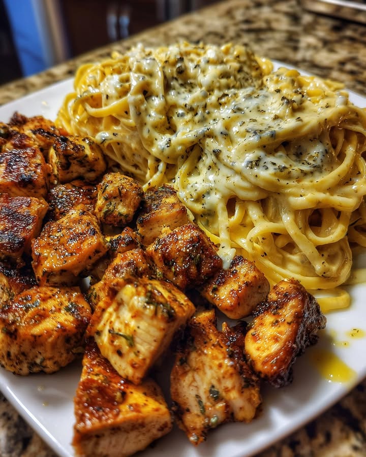 - Mélangez les linguines à la sauce crémeuse et servez avec le poulet.