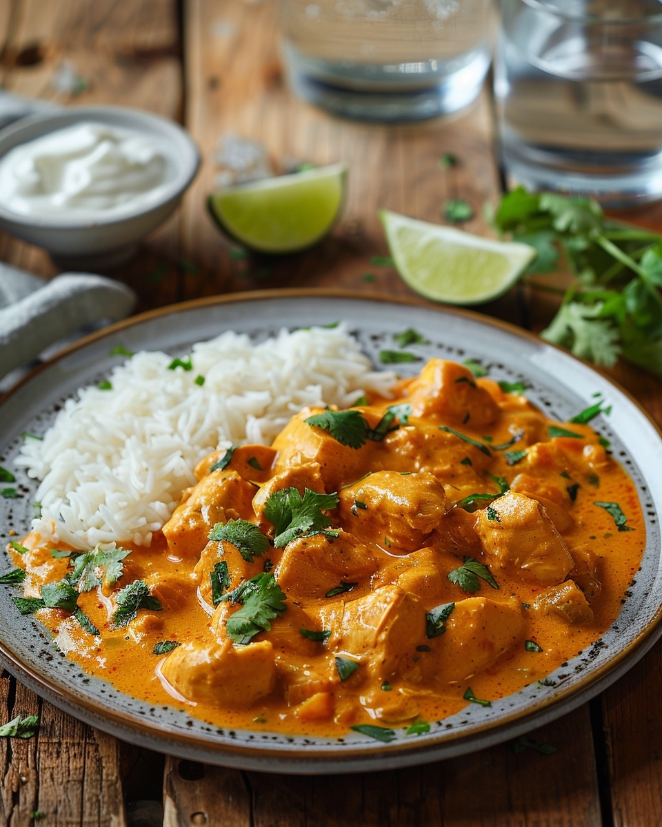 Le riz basmati reste l’accompagnement traditionnel et le plus populaire. Il absorbe magnifiquement la sauce crémeuse. Le pain naan ou les chapatis permettent de saucer généreusement. J’aime aussi servir une salade fraîche de concombre pour apporter de la fraîcheur. Des légumes vapeur comme le brocoli ou les haricots verts ajoutent des fibres et équilibrent le repas. Certains jours, je propose simplement une grande salade verte croquante avec une vinaigrette légère au citron.